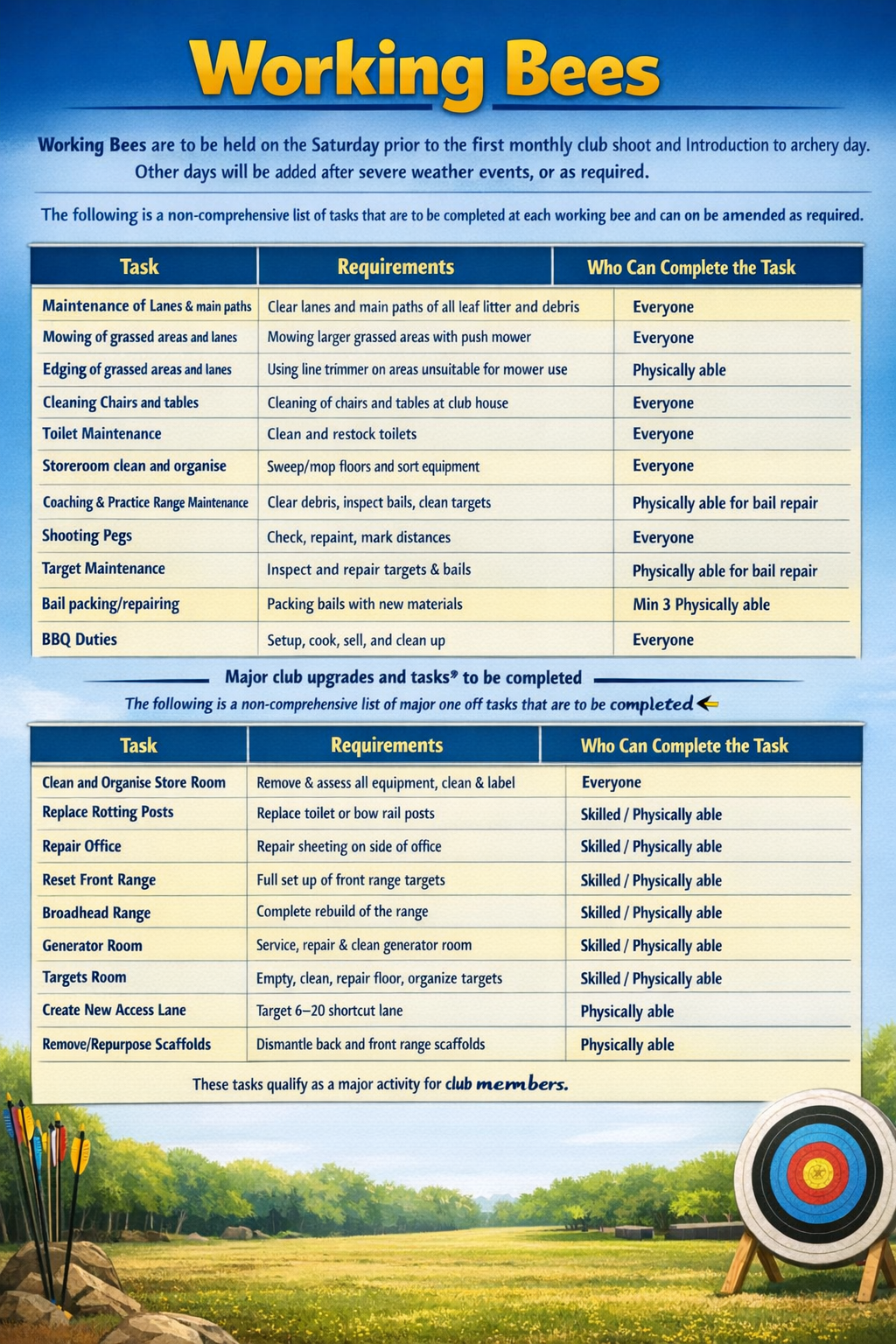 ALL RANGES WILL BE CLOSED AND OFF LIMITS TO ALL ARCHERS FROM 730am UNTIL THE WORKING BEE IS COMPLETE AT APPROXIMATELY 12pm (MIDDAY) ON THE DAY OF A WORKING BEE. THIS IS A SAFETY CONCERN AND IS NOT NEGITIABLE.