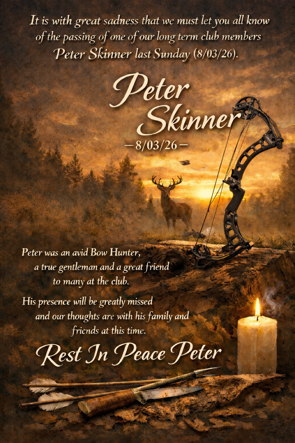 It is with great sadness that we must let you all know of the passing of one of our long term club members Peter Skinner last Sunday (8/03/26). Peter was an avid Bow Hunter, a true gentleman and a great friend to many at the club. His presence will be greatly missed and our thoughts are with his family and friends at this time. Rest In Peace Peter.